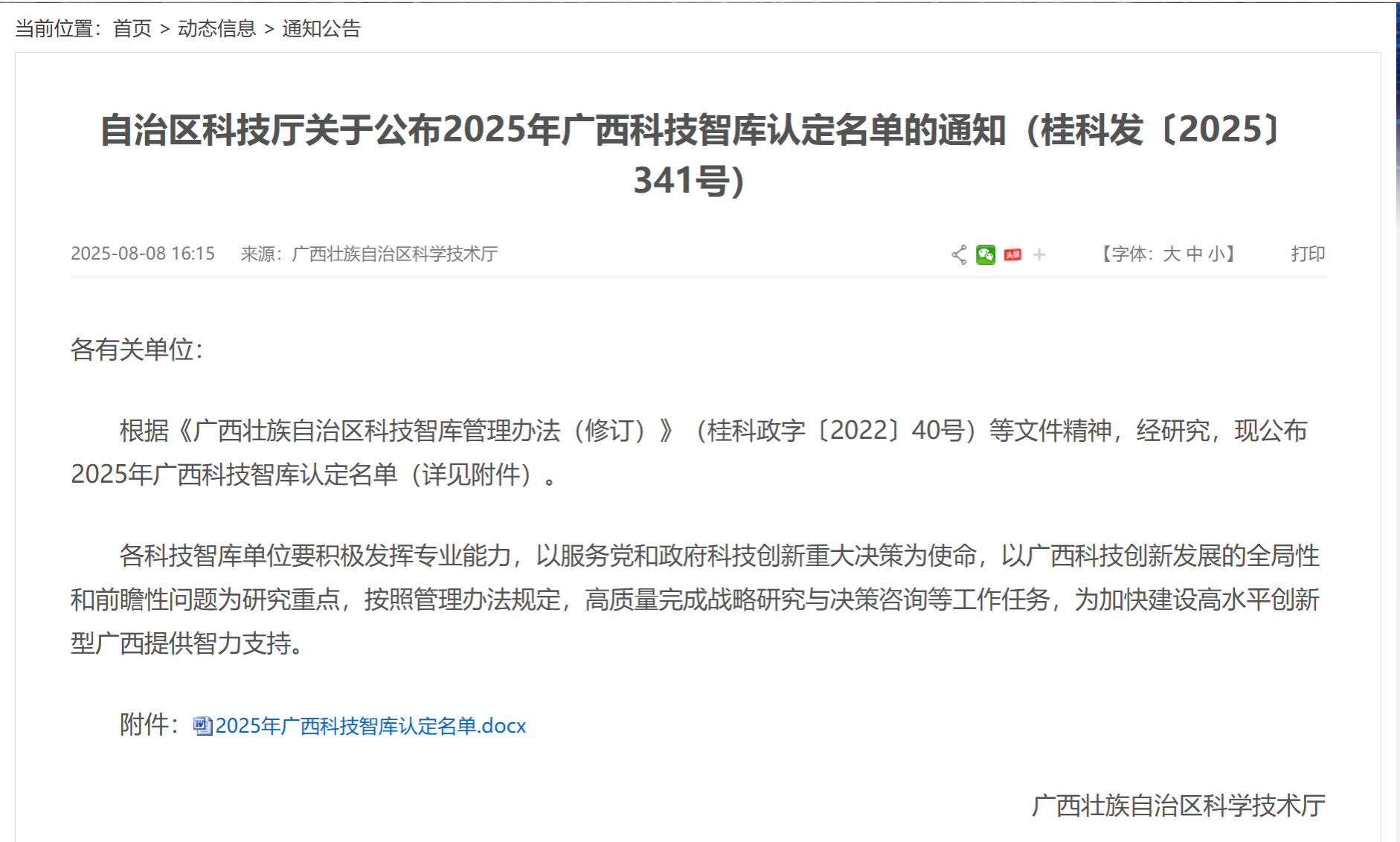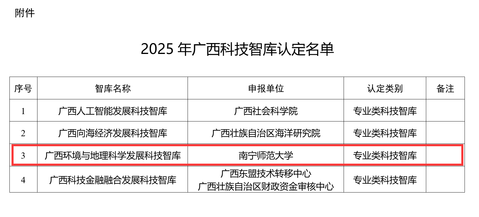 近日,廣西壯族自治區(qū)科學技術(shù)廳發(fā)布《關(guān)于公布2025年廣西科技智庫認定名單的通知》,我校申報的“廣西環(huán)境與地理科學發(fā)展科技智庫”憑借扎實的科研基礎(chǔ)、專業(yè)的研究團隊和精準的決策咨詢能力,成功入選認定名單。這標志著我校在服務(wù)廣西科技創(chuàng)新重大決策領(lǐng)域邁出了關(guān)鍵一步。