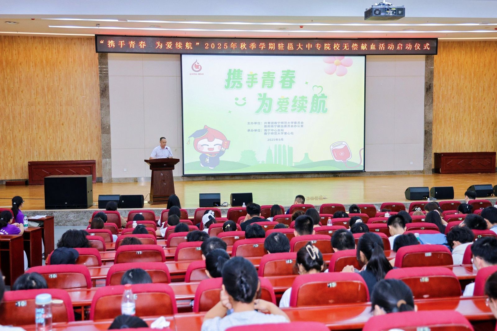 9月14日,“攜手青春 為愛續(xù)航”2025年秋季學(xué)期駐邕高校無償獻(xiàn)血活動啟動儀式在我校武鳴校區(qū)舉辦,南寧中心血站負(fù)責(zé)人,學(xué)校國內(nèi)合作處、校團(tuán)委負(fù)責(zé)人以及師生代表400余人參加了本次啟動儀式。