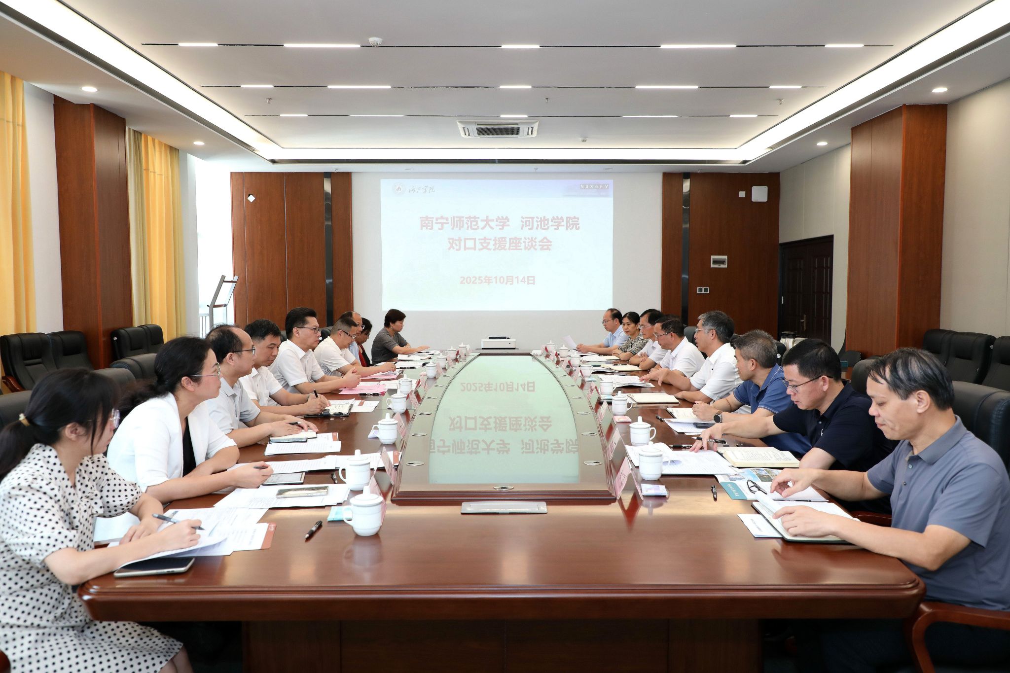 張鵬對河池學院的熱情接待表示感謝,并肯定了對口支援工作取得的階段性成效。他表示,我校與河池學院友誼深厚,兩校有相同的師范底色,有相似的發展歷程與現實校情,共同構筑了友好合作的堅實基礎。他指出,下一階段的對口支援工作要在精準二字上再下功夫、在機制建設上再求突破、在創新合作上再開新局,堅持互學共鑒,相互啟發、彼此賦能、共同進步,開創合作共贏新局面。