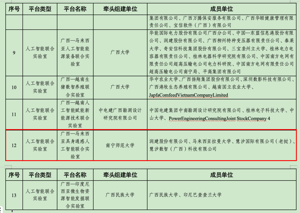 廣西—馬來西亞具身通感人工智能聯合實驗室是由我校物理與電子學院與潤建股份有限公司、馬來西亞拉曼大學、慧汐國際有限公司(老撾)、慧汐數智(廣西)科技有限公司合作共建。經過多年發展與積累,實驗室在人工智能領域,產生了一批高水平科技成果,取得了較好的經濟和社會效益。實驗室將進一步圍繞人工智能產業,以國家戰略需求、廣西發展規劃和學校發展需要為導向,以人工智能理論與應用為核心開展研究。