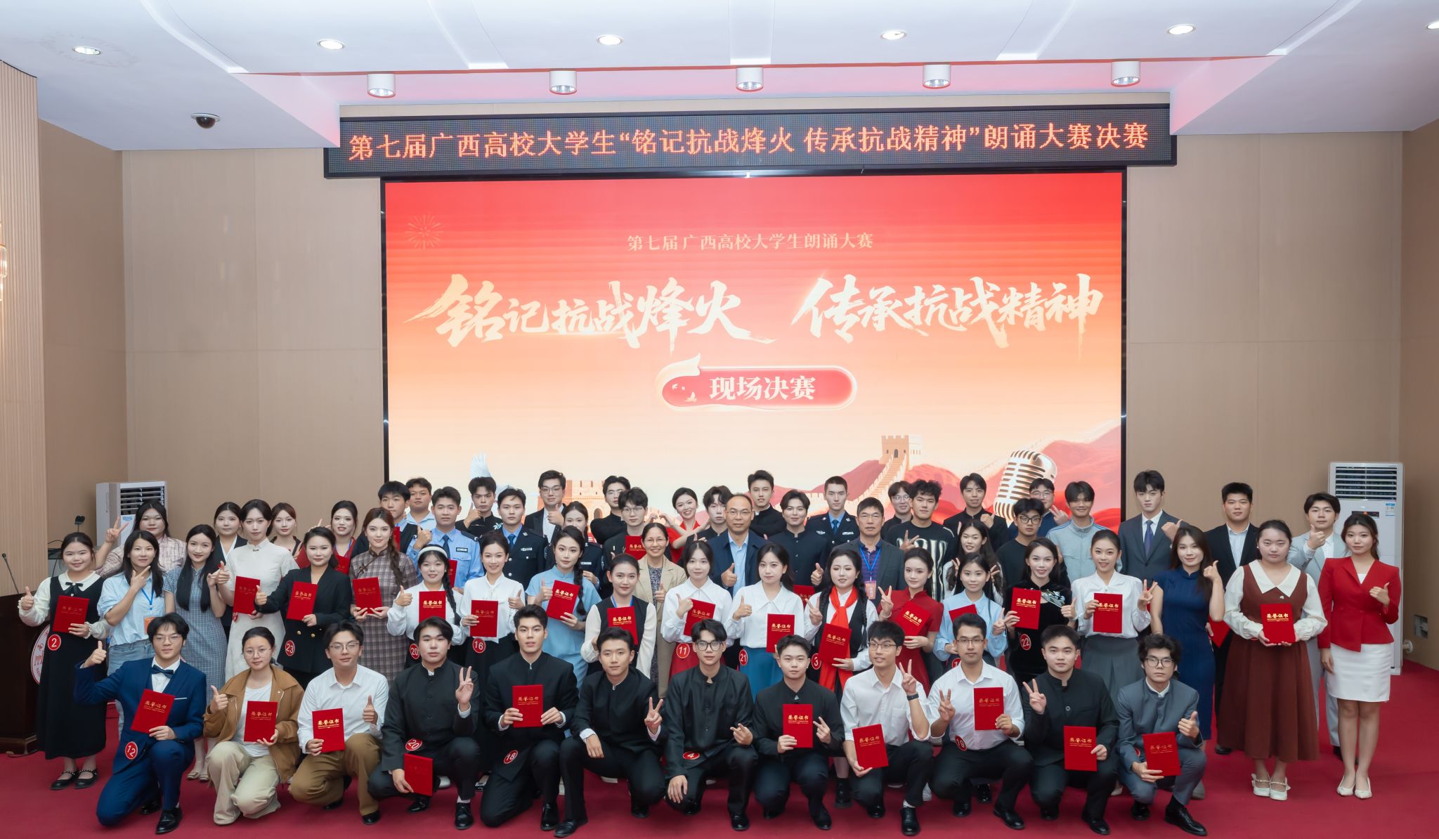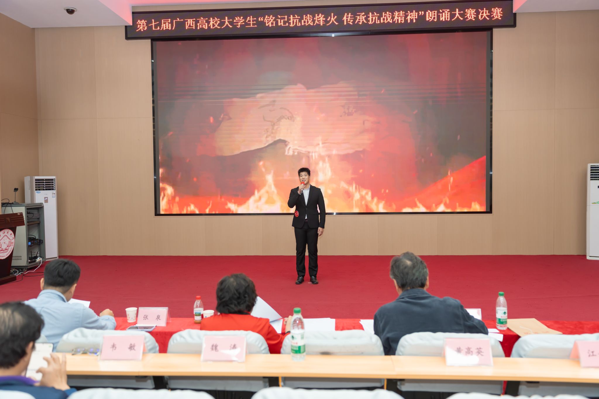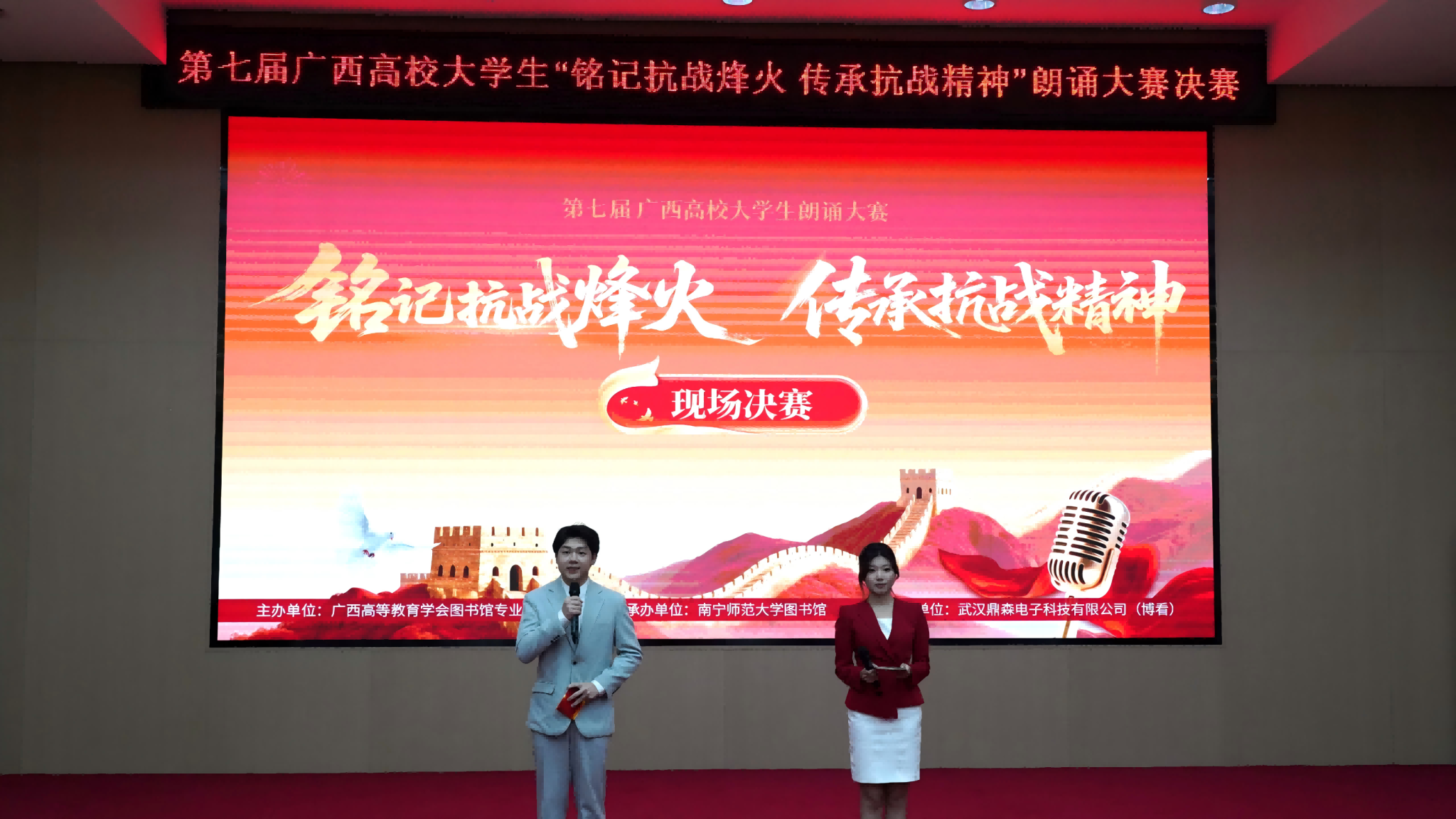 為紀念中國人民抗日戰爭暨世界反法西斯戰爭勝利80周年,弘揚偉大抗戰精神,推動愛國主義教育走深走實。11月16日,由廣西高等教育學會圖書館專業委員會主辦、我校圖書館承辦、武漢鼎森電子科技有限公司(博看)協辦的第七屆廣西高校大學生“銘記抗戰烽火 傳承抗戰精神”朗誦大賽決賽在我校明秀校區成功舉辦。學??倳嫀熈杭冶?,廣西高等教育學會圖書館專業委員會理事長、廣西大學圖書館館長李家軍出席開幕式并致辭。開幕式由我校圖書館館長葉佩珍主持。來自全區37所高校共150余名師生集聚決賽現場。