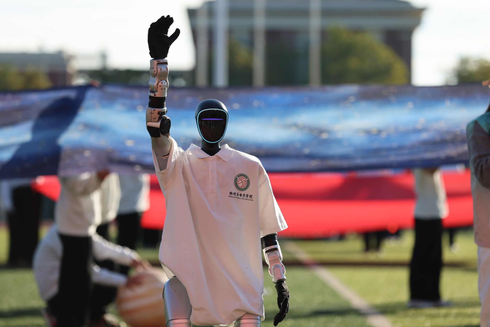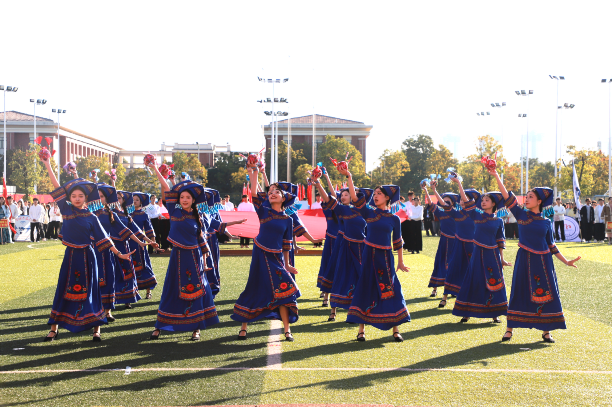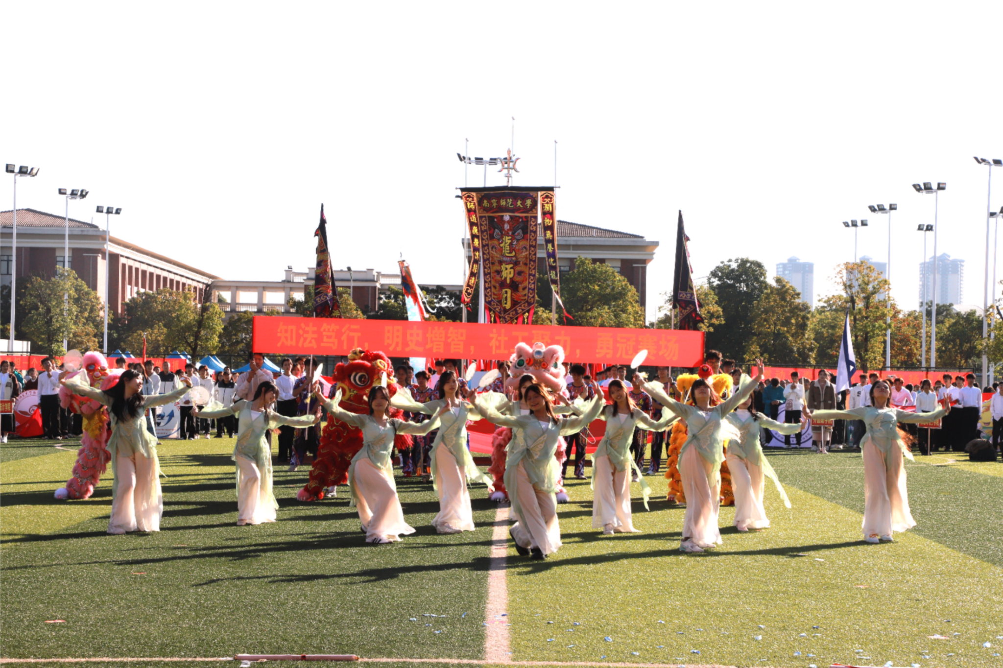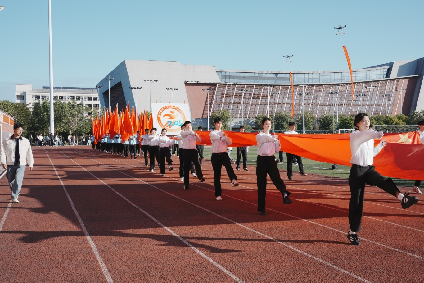 伴隨著激昂雄壯的《運動員進行曲》,紅旗護衛(wèi)隊率先入場,緊隨其后的各學院方塊隊邁著矯健整齊的步伐,喊著鏗鏘有力的口號依次亮相。“青春筑夢南師,強國有我擔當”“志存高遠,奮勇爭先”……高亢嘹亮的口號回響在運動場上空。入場式中,各學院方塊隊帶來了精彩紛呈的文藝駐停表演:酷炫吸睛的AI機器人表演、創(chuàng)意十足的服裝秀、熱情奔放的啦啦操、技藝精湛的舞獅、絢麗多彩的民族群舞與古風群舞等輪番上演,學校教職工代表還帶來了剛?cè)嵯酀陌硕五\表演,獨具匠心的藝術(shù)呈現(xiàn)為現(xiàn)場師生獻上了一場視覺盛宴,贏得陣陣掌聲與喝彩。