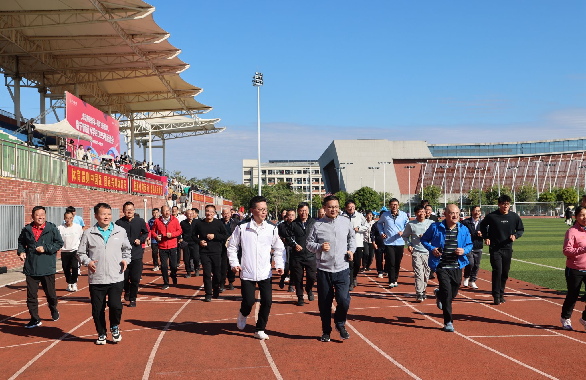 開幕式結(jié)束后,校領(lǐng)導(dǎo)帶領(lǐng)處級干部在田徑場上開展南寧師范大學2025年校園健身跑啟動儀式,并繞田徑場進行400米健身跑。