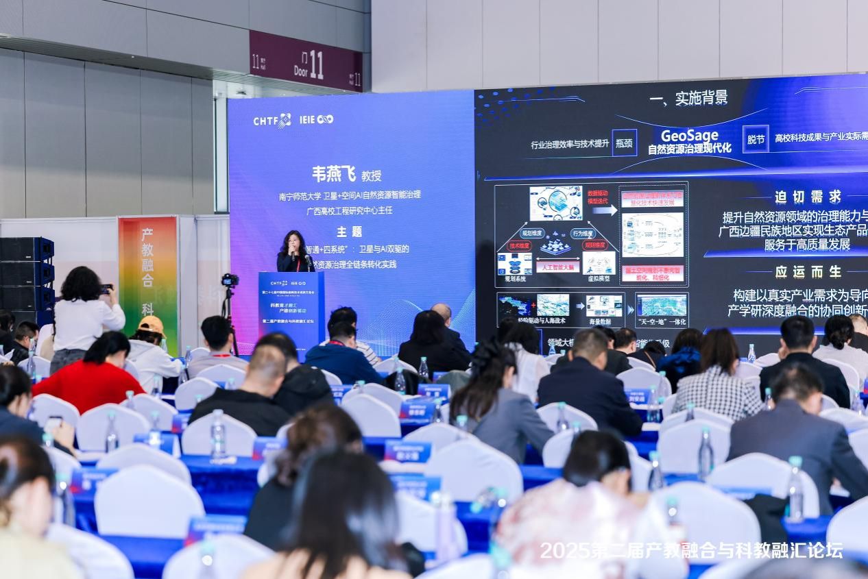 韋燕飛教授代表研究團(tuán)隊(duì)在現(xiàn)場(chǎng)作案例分享,展示了國(guó)內(nèi)首個(gè)省域自然資源治理AI大模型,通過(guò)技術(shù)融合構(gòu)建智能治理體系成果。本屆論壇以“科教育才融匯,產(chǎn)鏈創(chuàng)新驅(qū)動(dòng)”為主題,匯聚了來(lái)自各級(jí)政府、海內(nèi)外165所高等院校、數(shù)十家行業(yè)領(lǐng)軍企業(yè)及科研機(jī)構(gòu)的350余位代表,共同探討產(chǎn)業(yè)鏈、教育鏈、人才鏈、創(chuàng)新鏈深度融合的創(chuàng)新模式與實(shí)施路徑。