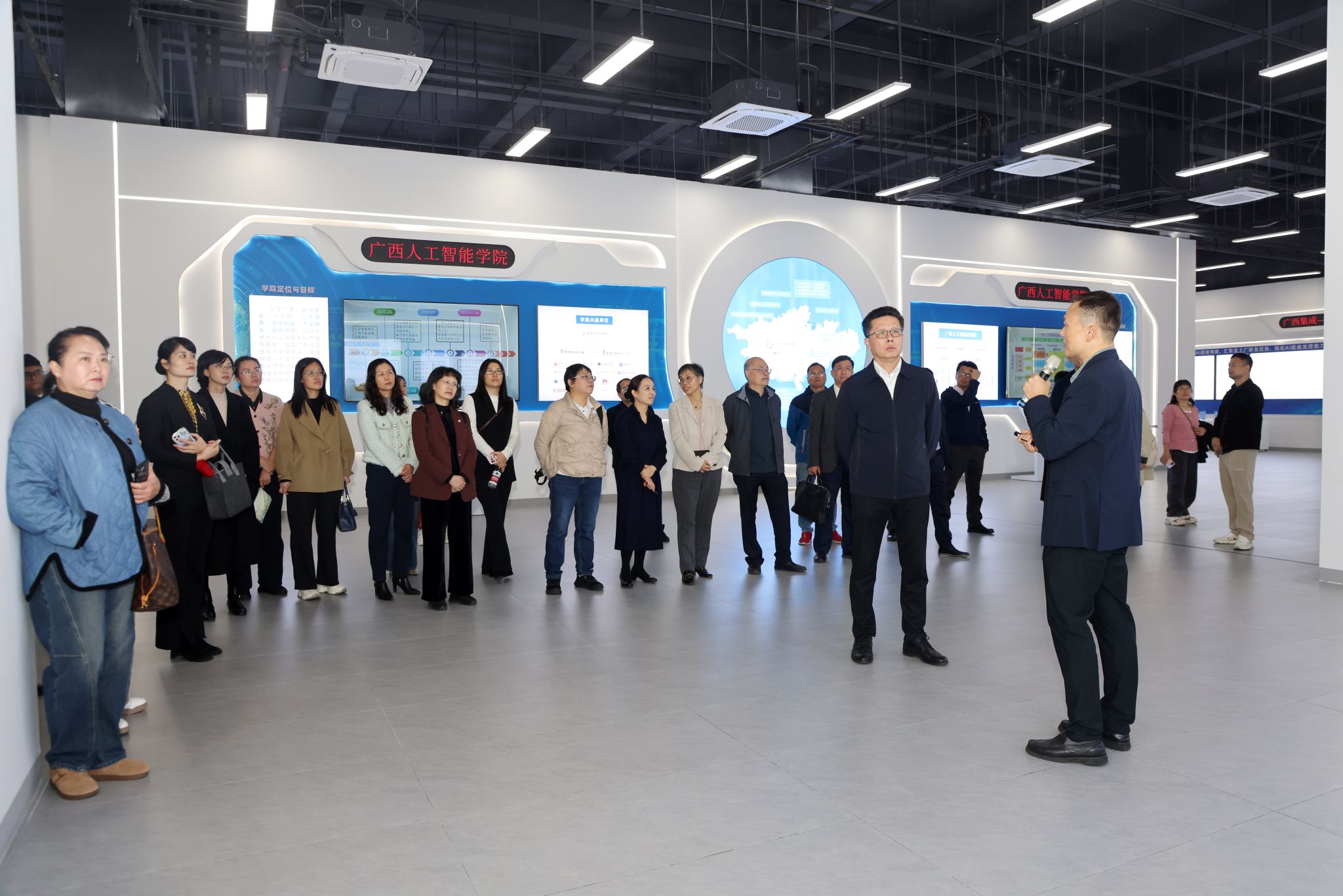 隨后,調研團來到廣西人工智能學院。該學院于2025年4月獲批成立,是面向東盟、服務廣西產業發展的戰略性產教融合平臺。在展示大廳,調研團聽取了學院在“機器人與具身智能”“數據跨境流動與安全”“農林人工智能應用”“小語種與口岸貿易智能”等21個核心方向的布局介紹,并現場觀摩了智能巡檢機器人、低空無人機監測系統、AI民族語言識別模型等科技成果原型。