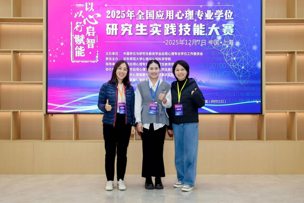 12月6日至7日,2025年全國應用心理專業學位研究生實踐技能大賽(決賽)在華東師范大學普陀校區順利舉行。我校教育科學學院2025級應用心理專業黃美幼同學榮獲心理咨詢面談技能比賽二等獎;2024級應用心理專業王雯萱和韋秋萍同學榮獲應用心理案例開發比賽三等獎,2024級應用心理專業碩王琪琪、白心怡和熊敏同學榮獲心理科普作品創作比賽三等獎。