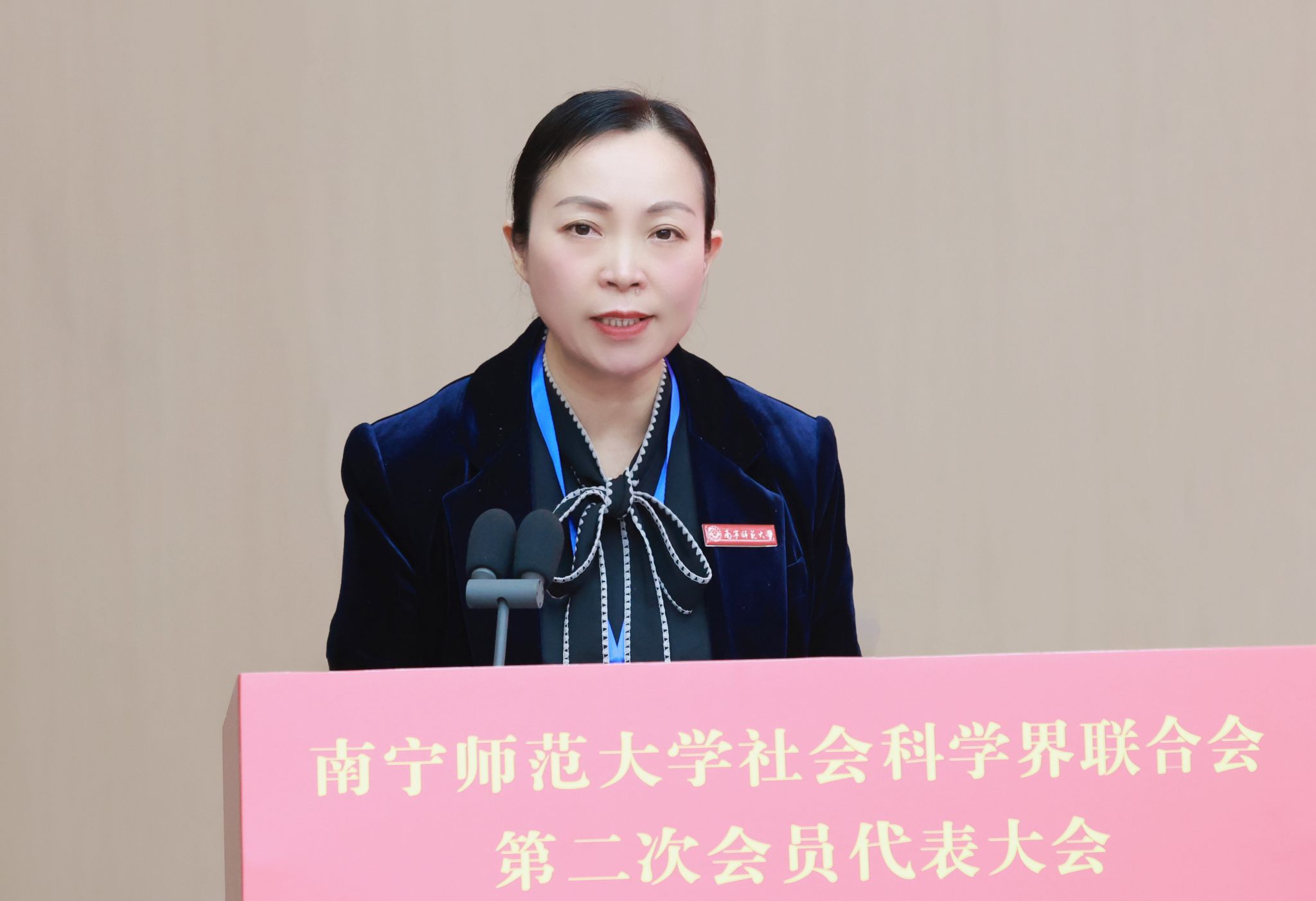 隨后,大會聽取了學校社科聯第一屆委員會主席龍妮娜作題為《立足邊疆、開放融合、協同創新,奮力書寫南寧師范大學哲學社會科學新篇章》的報告。報告對校社科聯第一次代表大會以來的各項工作進行了總結,五年來,校社科聯團結帶領廣大社科工作者,在強化理論武裝與政治引領、夯實學科基礎與人才培養、推動科研創新與成果突破、拓展社會服務與智庫建設、加強組織建設與治理效能等方面取得了一系列成效,為提升學校社科研究水平和服務地方發展能力作出了積極貢獻。報告指出,未來五年,校社科聯將以“數智賦能、融合創新、深耕區域、聚力東盟”為工作總基調,在五個方面持續發力:強化思想統領與戰略引領,筑牢社科發展政治根基;推動文科專業融合發展與數字化轉型升級,塑造未來文科新生態;深耕八桂大地,提升社科服務區域發展的貢獻度與顯示度;拓展中國—東盟合作網絡,搭建人文交流與學術合作堅實橋梁;創新運行機制,建設高效能、有溫度的“社科工作者之家”。