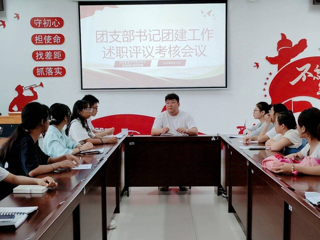 為進一步深化全面從嚴治團的要求,激發基層團組織活力,壓實基層團組織書記責任,促進各團支部之間的經驗交流與相互學習,9月13日,化學與材料學院在地化樓B228會議室順利召開了團支部書記述職大會,學院團總支書記、組織部成員以及全體團支部書記出席會議,會議由團總支書記王立彬主持。