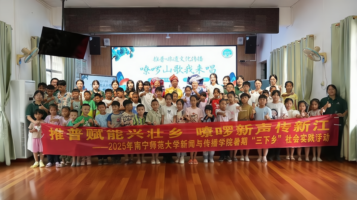 7月15日下午,新聞與傳播學院2025年暑期“三下鄉”“語”你同行實踐團走進新江鎮中心學校,開展“嘹啰山歌我來唱”學習體驗課。學院團委書記李櫻花、自治區級非物質文化遺產項目(壯族嘹啰山歌)代表性傳承人蘇蘭育、邕寧區級非物質文化遺產項目嘹啰山歌代表性傳承人農麗麗和新江鎮非物質文化遺產嘹啰山歌代表性傳承人楊愛蓮到場參加。本次活動由李櫻花老師主持。