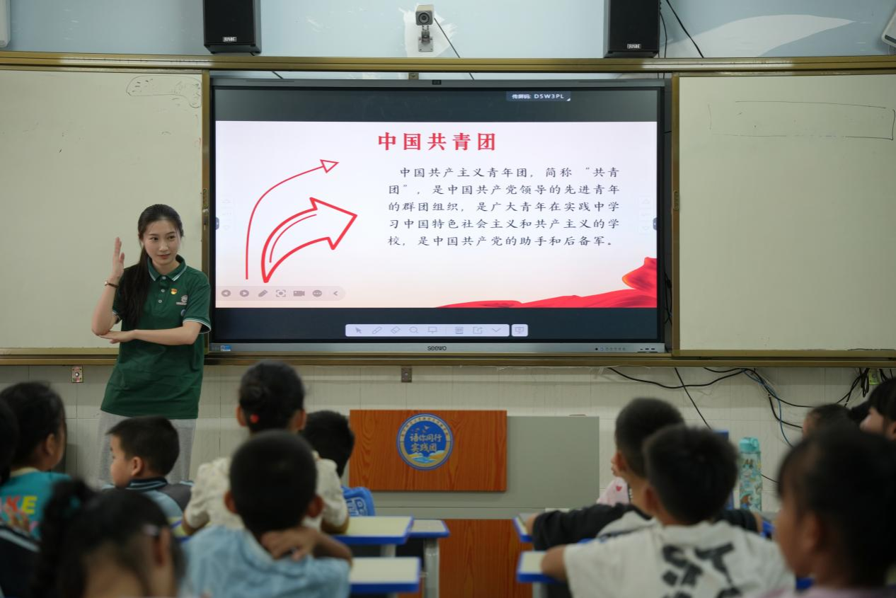 宣講組成員朱敏祺作為學生黨員,在黨史團史傳播的課堂中講解了中國共產(chǎn)黨和共產(chǎn)主義青年團的相關知識,帶領同學們認識了黨徽、黨旗和團徽、團旗,并且強調了中國共產(chǎn)黨和中國共青團之間的關系。朱敏祺還為同學們播放了與抗美援朝戰(zhàn)爭相關的動畫片,她講述了黃繼光、邱少云這兩位紅色模范人物的抗戰(zhàn)故事,闡述了抗美援朝戰(zhàn)爭對于捍衛(wèi)新中國和平與尊嚴的偉大意義。通過課堂,宣講組成員讓偉大抗美援朝精神能夠跨越時空,在新時代少年心中煥發(fā)出催人奮進的力量。