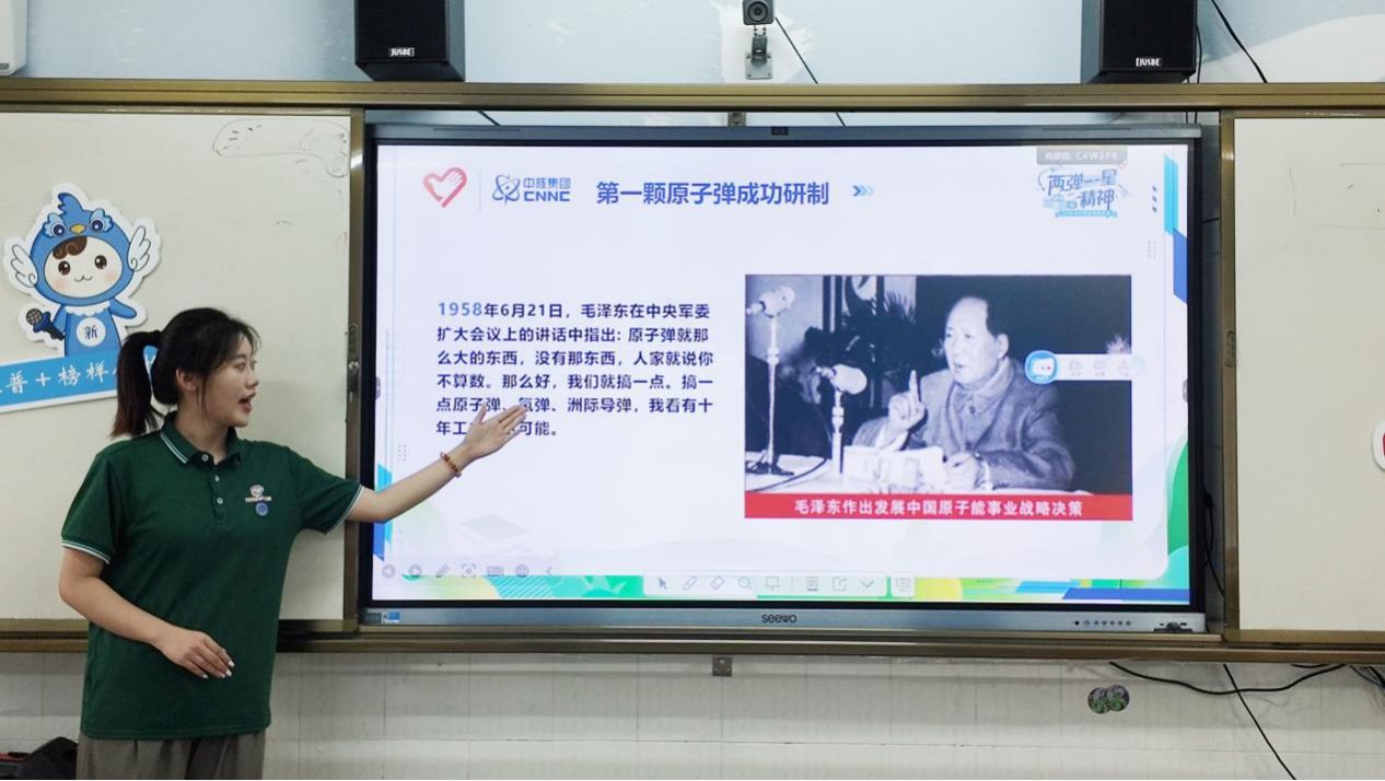 后勤組成員張子怡以“圖文 + 現(xiàn)場講解”的形式,將鈾礦石從廣西深山被發(fā)現(xiàn)、到經(jīng)提純轉化為核燃料、最終助力第一顆原子彈升空的“三生三世”緩緩道來。講解中,她為同學們播放了1964年10月16日羅布泊核爆試驗的影像 ——當蘑菇云在戈壁灘上驟然升騰,鏡頭里科研人員歡呼擁抱的身影與屏幕外孩子們的屏息形成奇妙共振。那些帶著顆粒感的黑白畫面里,既有“開業(yè)之石”鈾礦石的質樸光澤,也有“干驚天動地事”的元勛們在帳篷里演算的燈光,孩子們透亮的眼睛里,先映出蘑菇云的壯闊,又慢慢漾起對“隱姓埋名人”的崇敬。