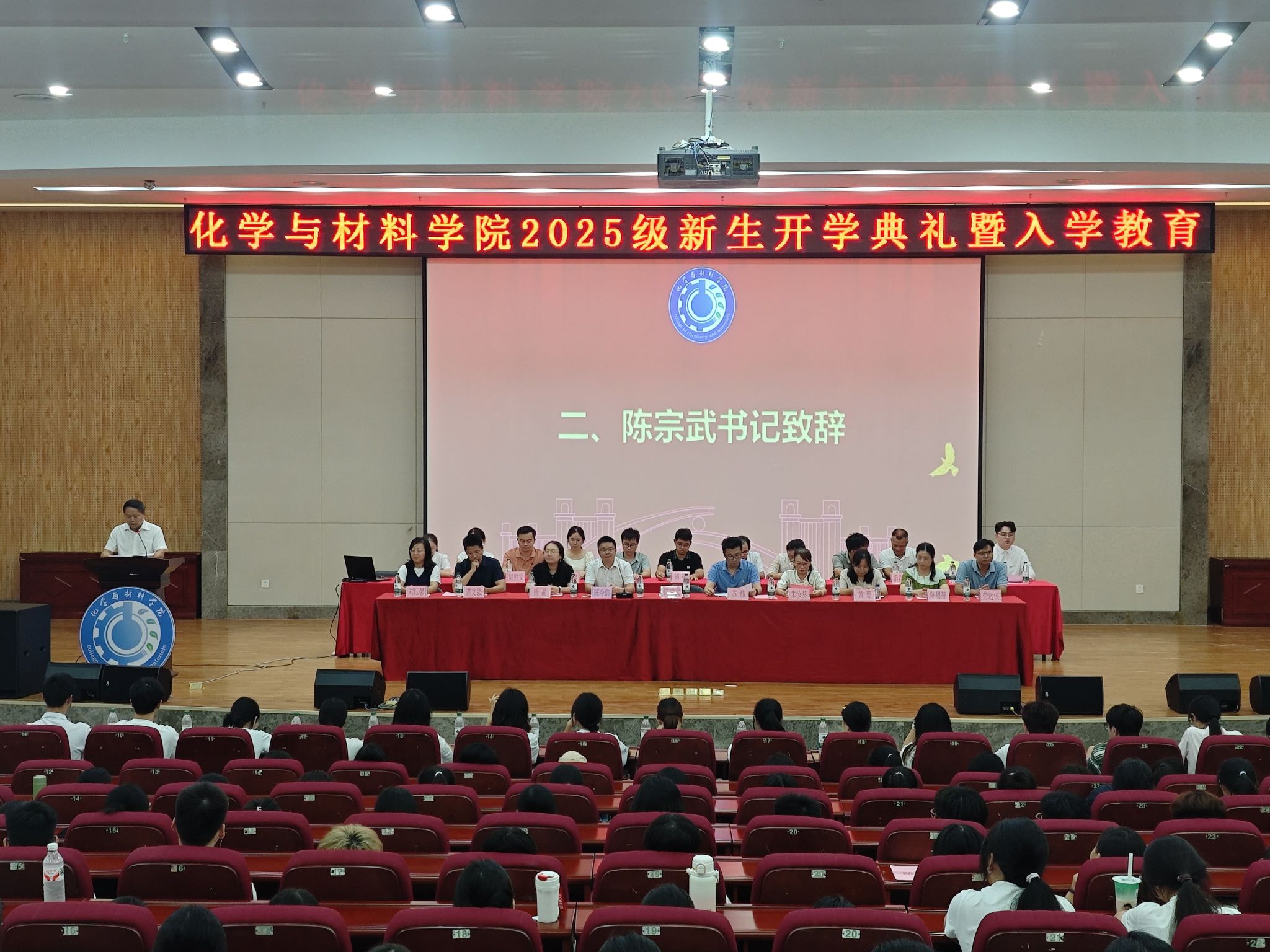 為歡迎新生的到來,引導(dǎo)新生樹立遠(yuǎn)大目標(biāo),科學(xué)規(guī)劃學(xué)業(yè)發(fā)展,化學(xué)與材料學(xué)院于9月9日在武鳴校區(qū)圖書館報(bào)告廳開展2025級(jí)新生開學(xué)典禮暨新生入學(xué)教育活動(dòng)。學(xué)院黨委書記陳宗武,院長蘇煒,黨委副書記陳今浩,副院長朱汝葵,副院長楊晶,院長助理、專業(yè)負(fù)責(zé)人、班主任、輔導(dǎo)員以及25級(jí)全體新生參加。活動(dòng)由學(xué)院輔導(dǎo)員劉楊老師主持。