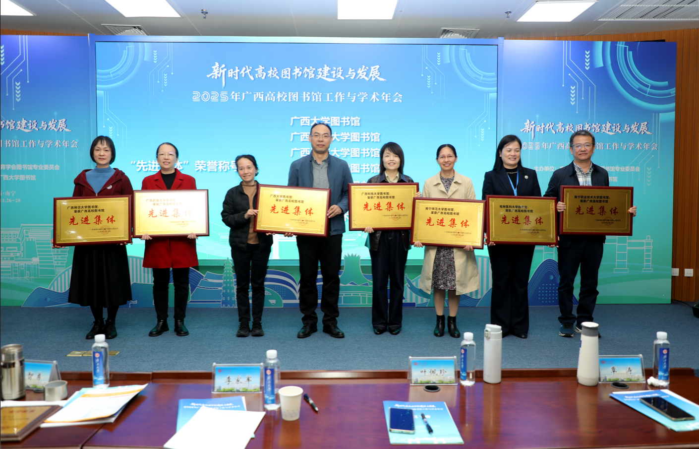 本次年會以“新時代高校圖書館建設(shè)與發(fā)展”為主題,匯聚了全區(qū)眾多高校圖書館界的領(lǐng)導(dǎo)、專家學(xué)者與館員代表,圍繞“十五五”規(guī)劃背景下高校圖書館的服務(wù)轉(zhuǎn)型與能力重構(gòu)、智慧圖書館建設(shè)、信息素養(yǎng)教育、服務(wù)創(chuàng)新、閱讀推廣等議題展開深入研討。會議還對廣西高等教育學(xué)會圖書館專業(yè)委員會2025年工作進(jìn)行了總結(jié),并對近四年來在全區(qū)高校圖書館工作中表現(xiàn)突出的圖書館、館長及館員給予表彰,共評選出先進(jìn)集體7個、優(yōu)秀館長14名、優(yōu)秀館員25名。我校圖書館憑借在制度建設(shè)、資源建設(shè)、服務(wù)創(chuàng)新及積極參與圖專委工作和活動、推動全區(qū)高校圖書館事業(yè)發(fā)展等方面的突出表現(xiàn),榮獲廣西高校圖書館“先進(jìn)集體”稱號,黃春燕館員榮獲“優(yōu)秀館員”。