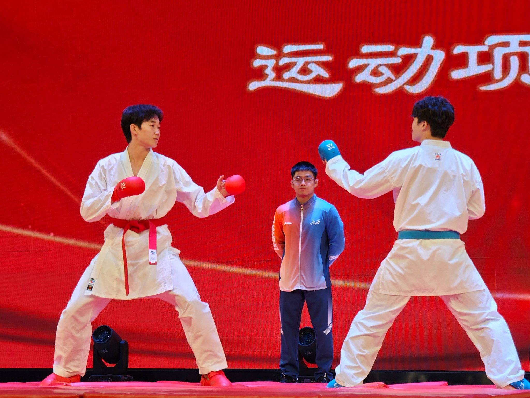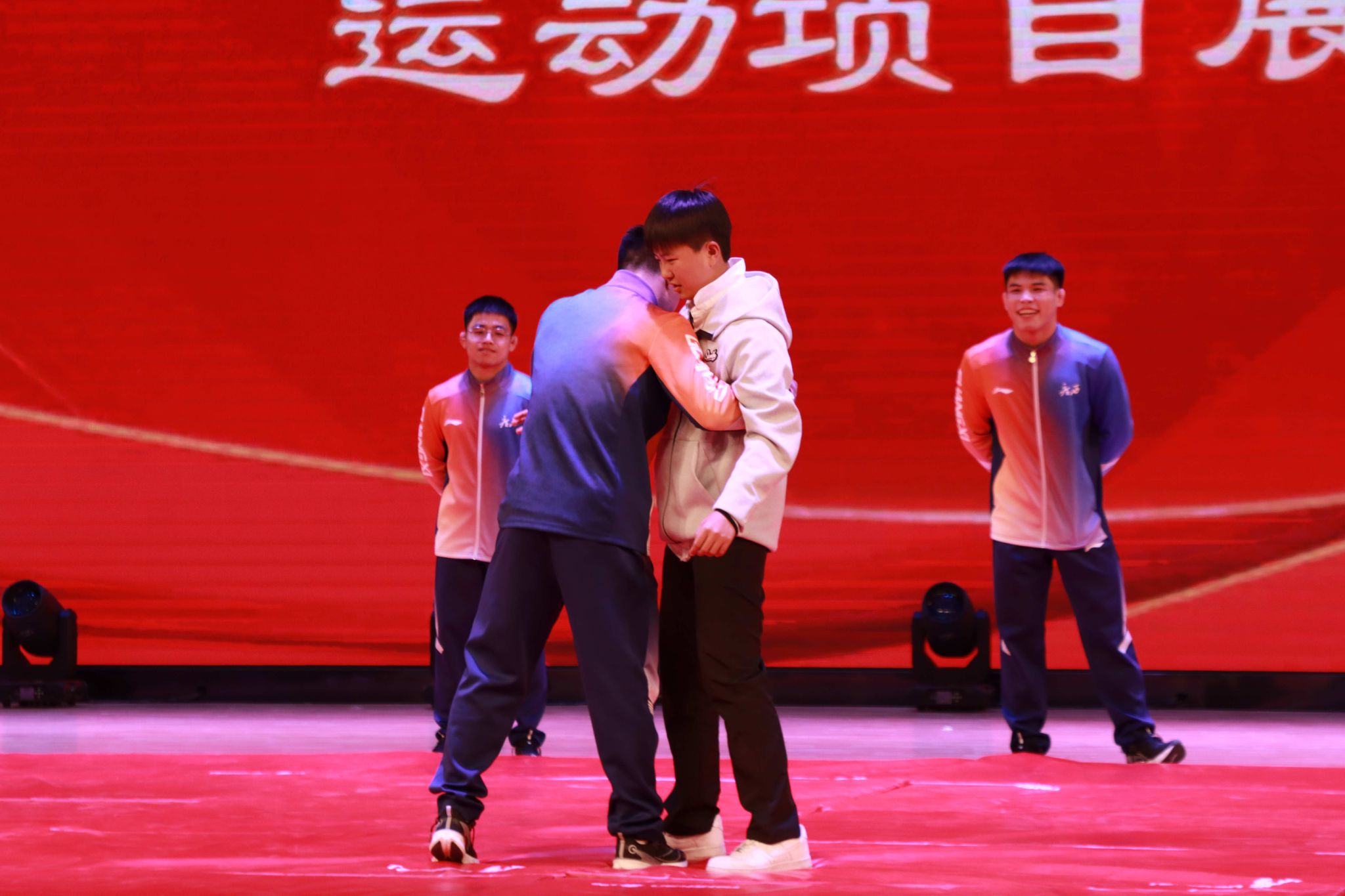 互動環(huán)節(jié)將現(xiàn)場氣氛推向高潮。多名學生在趙芳院長的邀請下登臺,在冠軍指導(dǎo)下親身體驗摔跤動作。冠軍們耐心講解、親身示范,報告廳化身為充滿熱情與活力的互動課堂。隨后的運動項目展演環(huán)節(jié),運動員們相繼展示了摔跤、柔道、空手道、拳擊、跆拳道五個項目的技術(shù)動作與對抗演示,扎實的基本功與流暢的攻防轉(zhuǎn)換,引來陣陣掌聲,充分展現(xiàn)了重競技運動的多樣魅力。