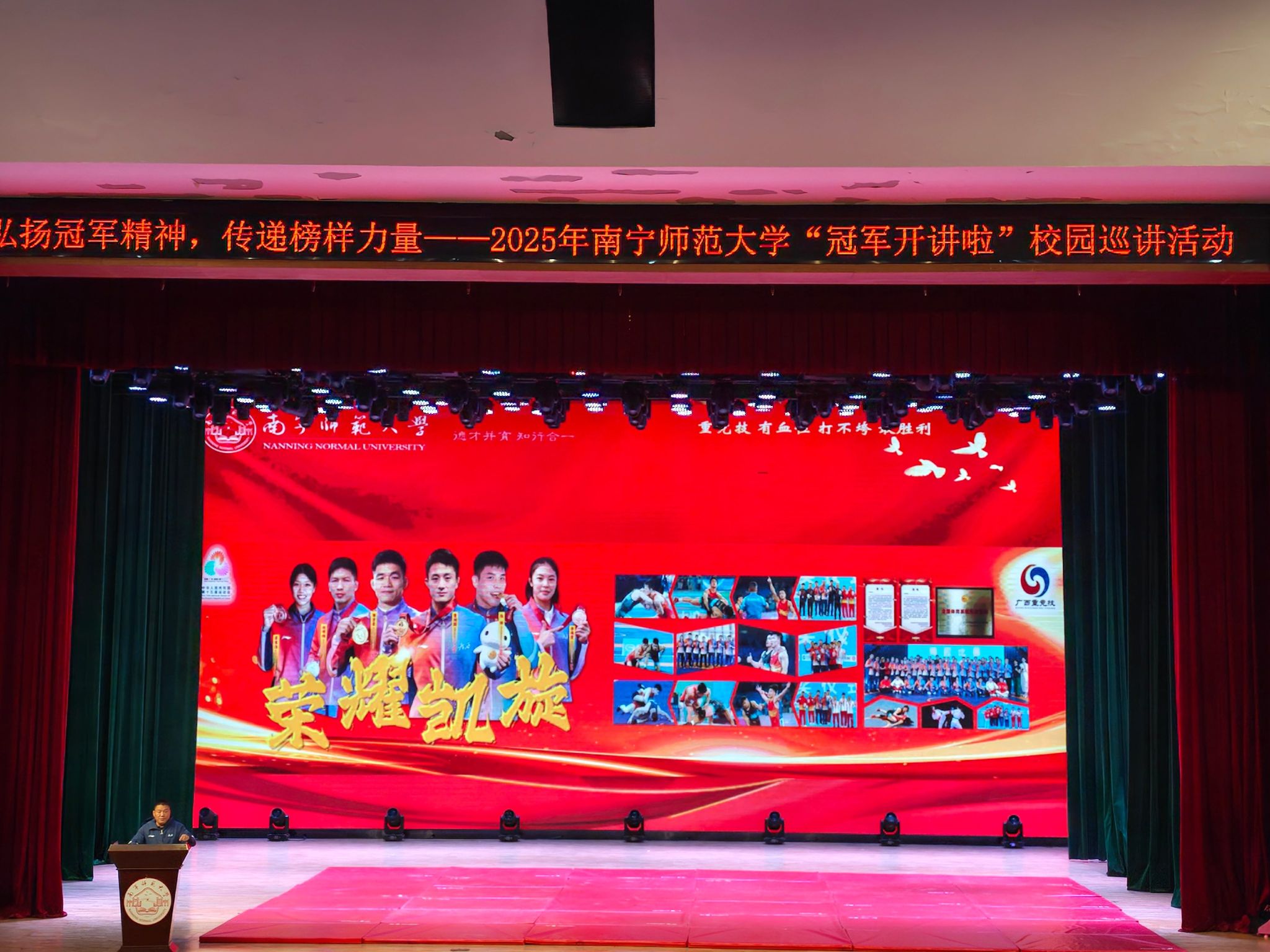 11月29日下午,我校武鳴校區(qū)音舞樓一號報告廳內(nèi)氣氛熱烈、掌聲不斷,“冠軍開講啦”校園巡講活動在此舉行。活動由體育與健康學院院長趙芳主持,特邀廣西重競技運動發(fā)展中心主任陳衛(wèi)、國家摔跤隊教練李征宇,以及曹利國、鄒萬豪、陸鋒等全運會冠軍走進校園,與師生共話拼搏精神與體育人生。學校學生工作部副部長鄧運明、體育與健康學院黨委副書記陳軍弟等嘉賓出席活動。