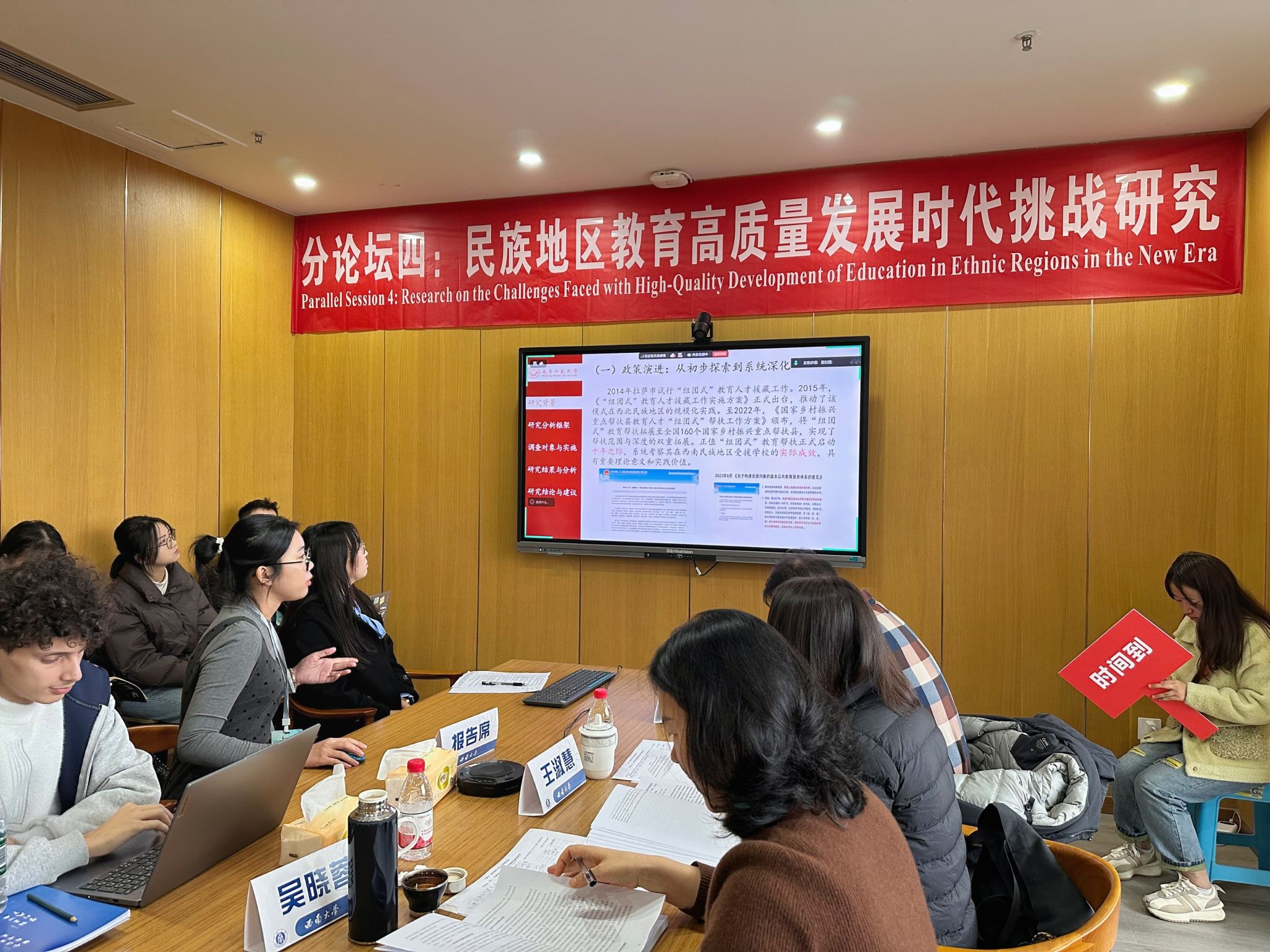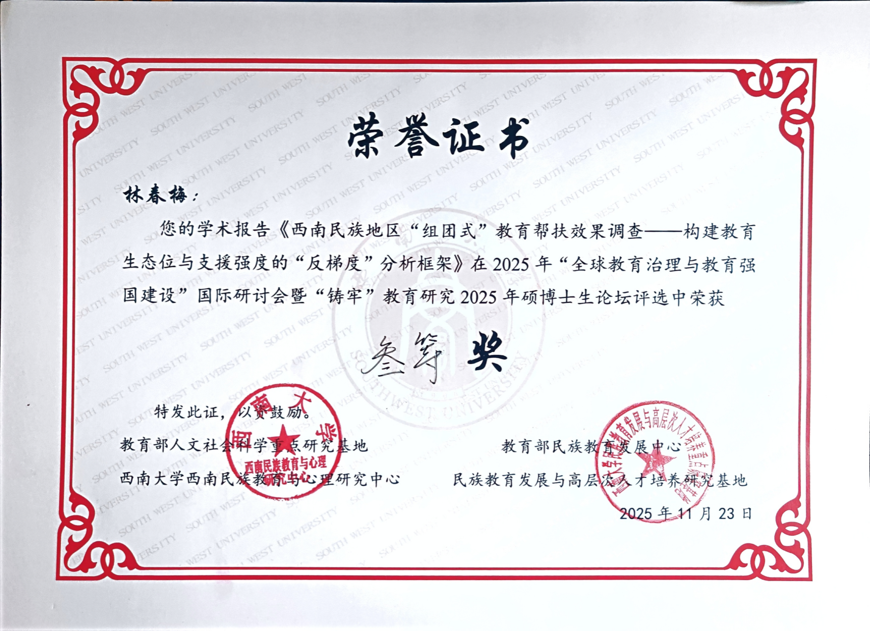 初等教育學(xué)院2024級(jí)小學(xué)教育專業(yè)碩士研究生林春梅和宋曉巧一同參與此次國際學(xué)術(shù)研討會(huì)及碩博論壇。林春梅同學(xué)在分論壇四“民族地區(qū)教育高質(zhì)量發(fā)展時(shí)代挑戰(zhàn)研究”中,代表課題組作了題為《西南民族地區(qū)“組團(tuán)式”教育幫扶效果調(diào)查——構(gòu)建教育生態(tài)位與支援強(qiáng)度的“反梯度”分析框架》的學(xué)術(shù)報(bào)告。該報(bào)告內(nèi)容系2024年度國家社會(huì)科學(xué)基金教育學(xué)青年項(xiàng)目“西南民族地區(qū)‘組團(tuán)式’教育幫扶的效果評(píng)價(jià)及政策優(yōu)化研究”的階段性研究成果,由課題負(fù)責(zé)人初等教育學(xué)院吳璇博士指導(dǎo)完成。報(bào)告內(nèi)容扎實(shí)、邏輯嚴(yán)謹(jǐn)、表達(dá)清晰,獲得與會(huì)專家高度評(píng)價(jià),并榮獲本屆碩博士生論壇三等獎(jiǎng)。