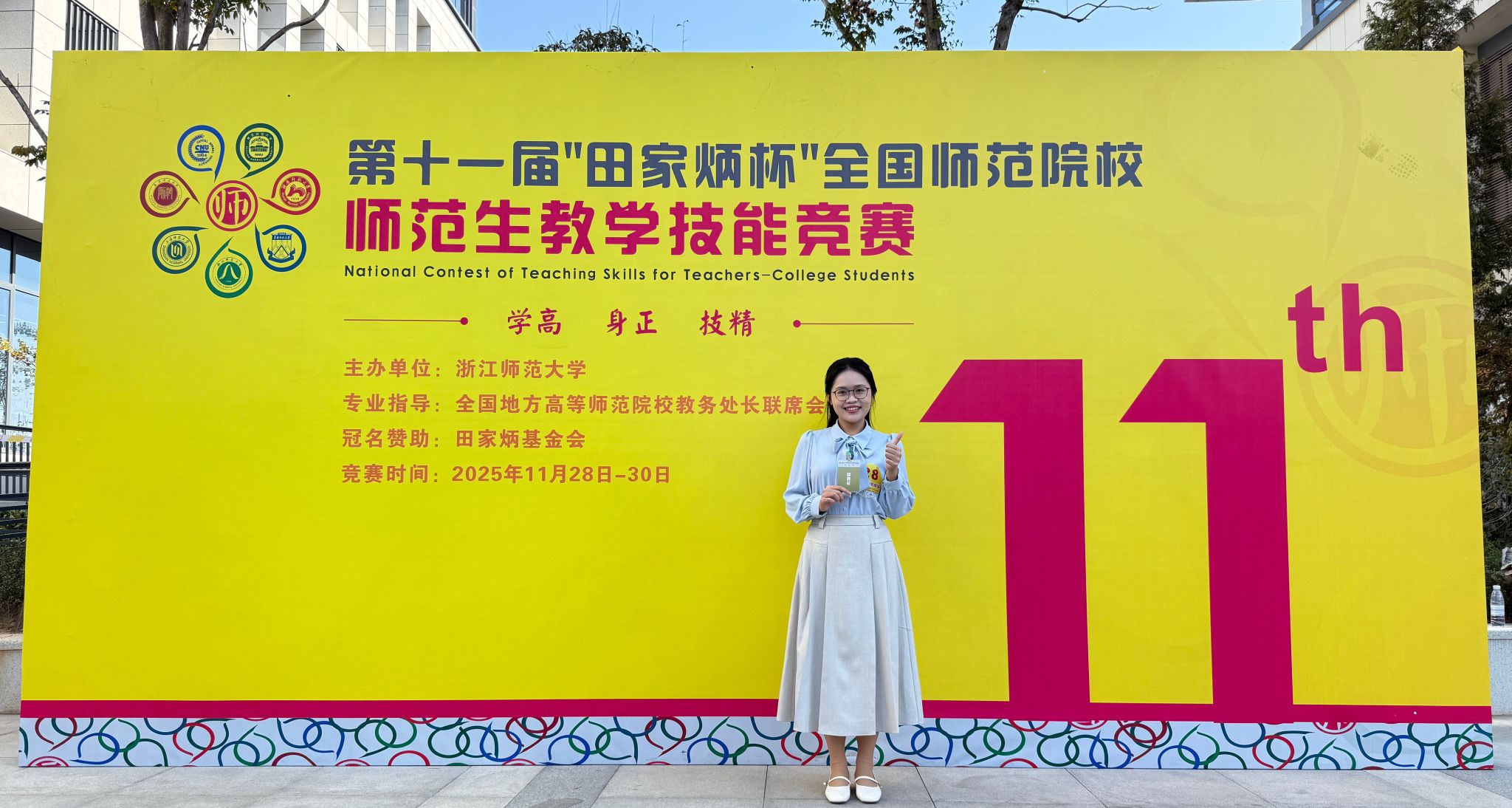 11月28日—11月30日,第十一屆“田家炳杯”全國師范院校師范生教學技能競賽決賽在浙江師范大學舉行。本次競賽共吸引了來自全國289所院校的2345名選手參加,參賽院校數與選手數均創歷史之最。決賽階段共有來自178所院校的561名選手到現場參加決賽,最終角逐產生一等獎188名、二等獎373名。馬克思主義學院2022級思想政治教育專業2班的譚章鈺同學在徐欣、馮舒讌、宋雪三位老師的悉心指導下,經過初賽激烈競爭,成功入圍決賽,并在決賽中憑借出色的綜合素質表現,榮獲一等獎的好成績,馬克思主義學院繼第八屆、第十屆獲得全國一等獎后繼續蟬聯此殊榮。