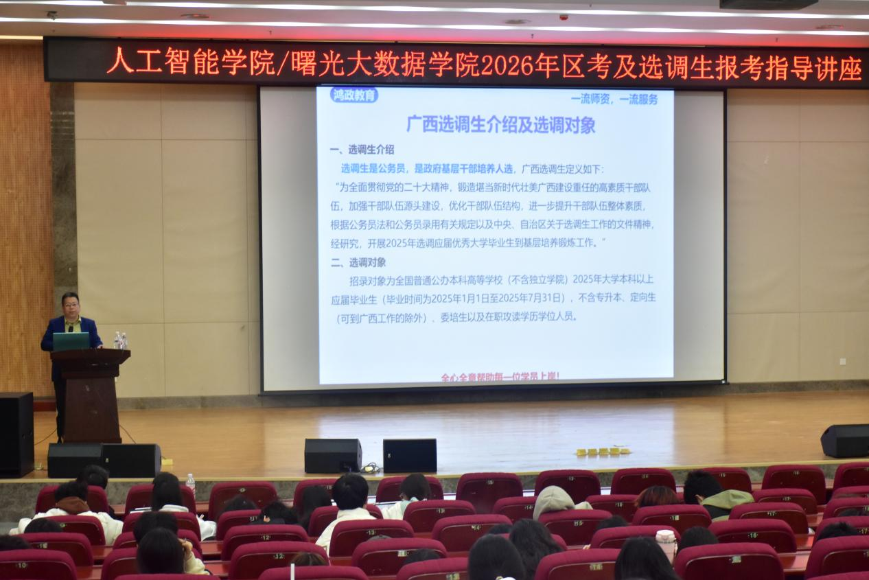 為幫助學生了解公職招錄政策,科學規劃備考,12月4日,人工智能學院在圖書館報告廳舉辦2026年廣西區考及選調生報考指導講座。講座特邀鴻政教育資深講師宋秉桂主講,學院共計370余名學生參加。