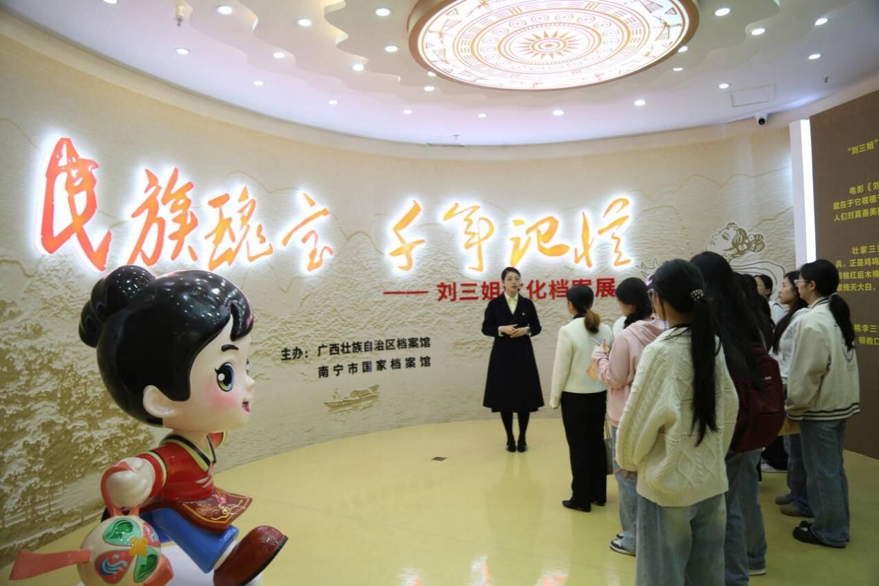 隨后,一行人前往“民族瑰寶,千年記憶——劉三姐文化檔案展”。展覽以豐富的圖文、影像及實物檔案,系統展現了劉三姐文化源遠流長的發展歷史及其蘊含的多民族交融共生特質。文學院師生立足中國語言文學的學科視角,深入探討了這一文化符號在增強文化認同、促進民族團結、鑄牢中華民族共同體意識方面的重要作用。