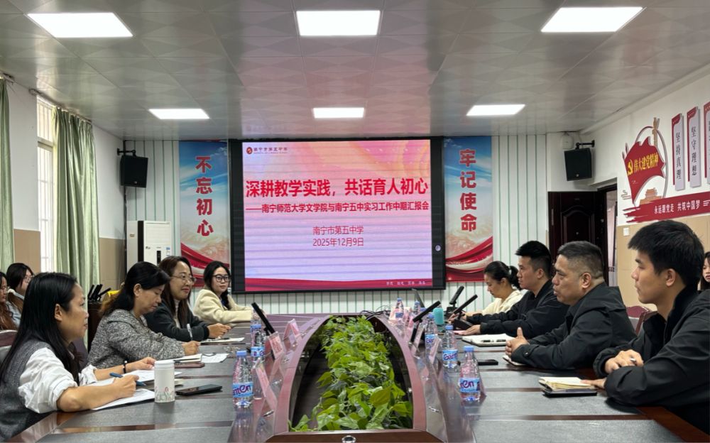 2025年12月5日,南寧師范大學文學院與南寧市第五中實習工作中期匯報會在南寧五中圖書館六樓會議室舉行,由南寧五中教務處莫慶信副主任主持。五中校長蔣振恩、副校長陳耀康、指導教師代表,文學院副院長張淑云、實習帶隊教師、實習學生齊聚。