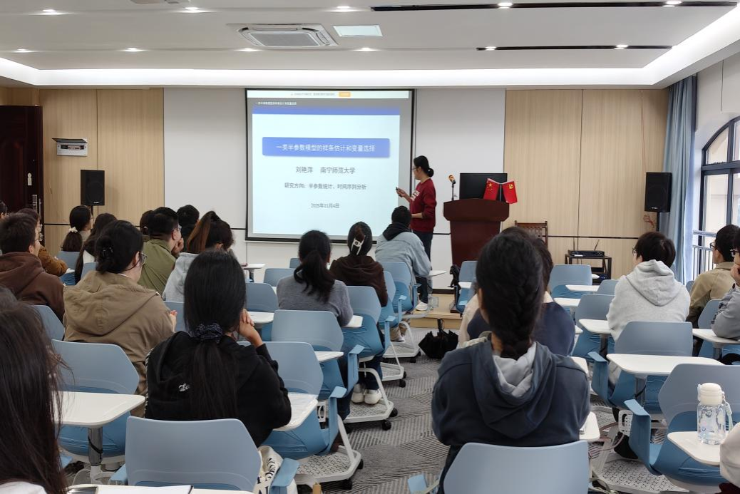 報告中,劉艷萍以深入淺出的方式,系統且全面地梳理了經典模型估計方法的發展歷程與演變脈絡,緊密結合自身在該領域的最新研究成果,深入剖析了半參數模型“既具備參數模型良好的可解釋性,又擁有非參數模型高度靈活性”這一獨特且顯著的核心優勢,讓在場師生對半參數模型有了更為直觀和深刻的認識。