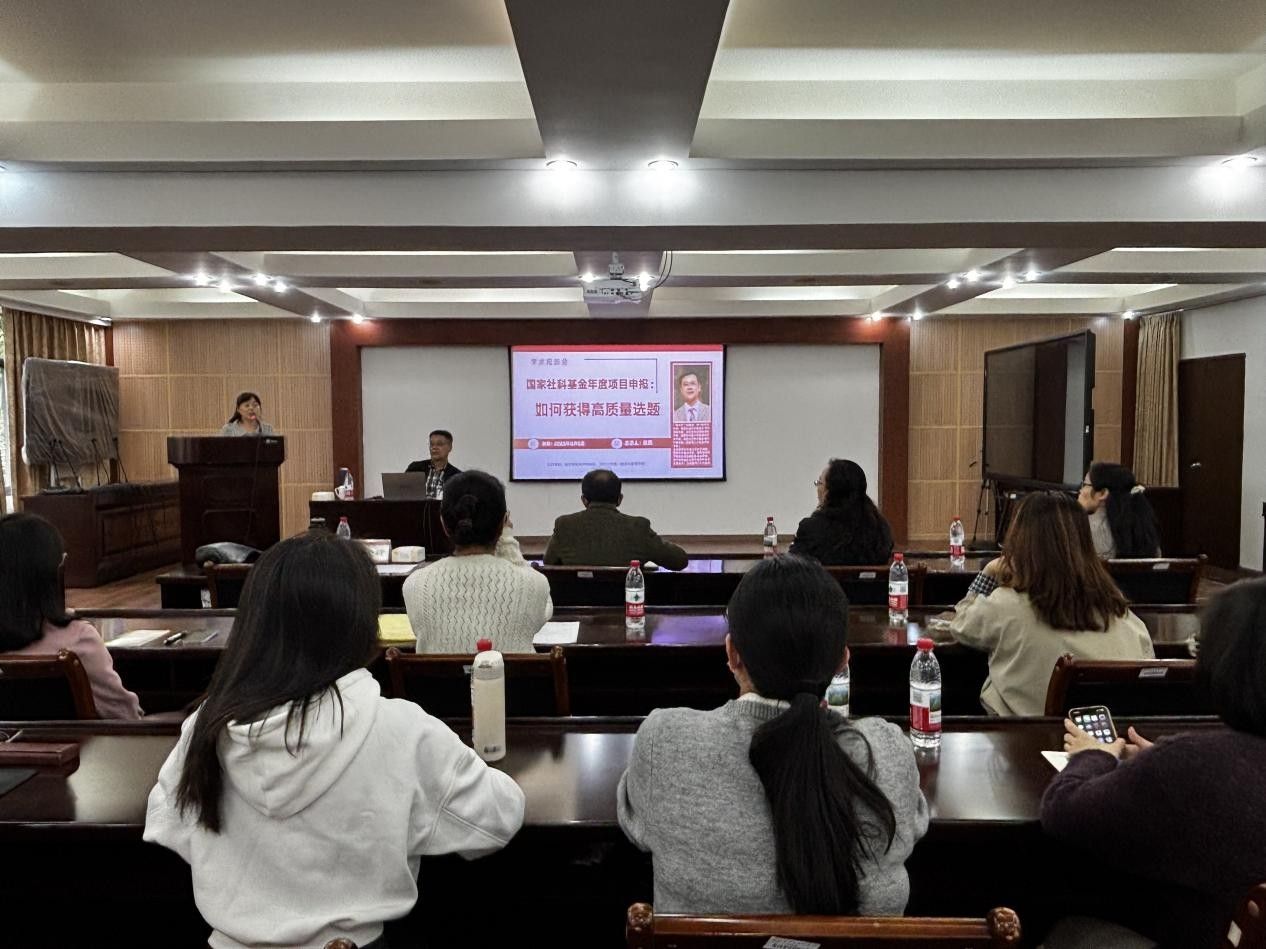 為切實做好2026年度國家社會科學基金項目的申報組織工作,有效提升我校教師的項目申報質量,11月5日下午,科研處、國內合作處、經濟與管理學院在明秀校區鴻遠樓409室聯合主辦了2026年度國家社科項目申報輔導講座。此次講座邀請廣西大學黎鵬教授做申報輔導,經濟與管理學院院長何玲玲教授主持。