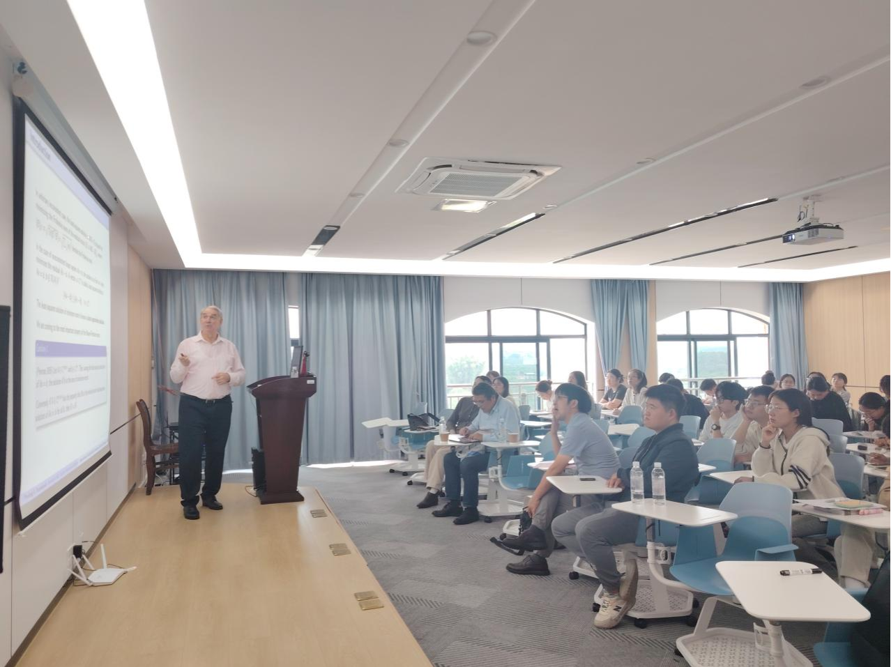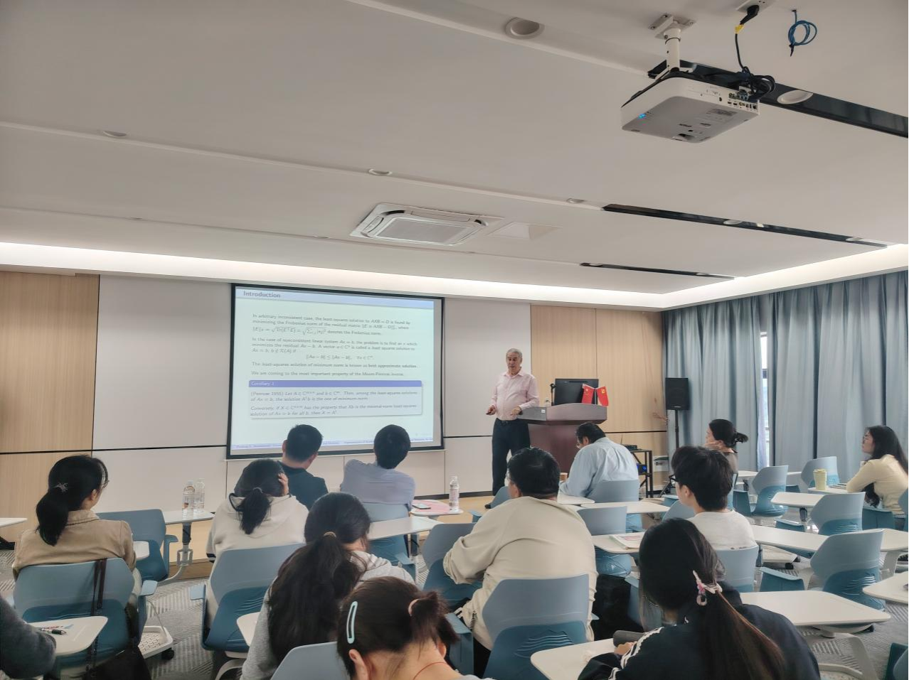 11月8日,應(yīng)廣西應(yīng)用數(shù)學(xué)中心(南寧師范大學(xué))的邀請(qǐng),塞爾維亞尼斯大學(xué)STANIMIROVIC PREDRAG教授為中心骨干成員以及碩士研究生做了題目為《基于C-積的三階張量特征值計(jì)算》的學(xué)術(shù)報(bào)告,報(bào)告由數(shù)學(xué)與統(tǒng)計(jì)學(xué)院劉利斌副院長(zhǎng)主持。