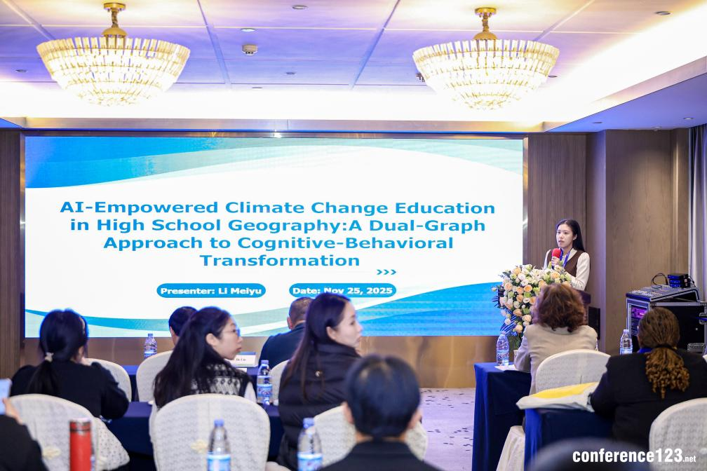會議期間,李美豫同學作了題為“AI-Empowered Climate Change Education in High School Geography:A Dual-Graph Approach to Cognitive-Behavioral Transformation”的專題匯報。該匯報源于其主持的自治區研究項目《基于高中地理氣候變化教育認知-行為轉化機制視角下的AI技術干預策略設計》,是項目推進的一項重要階段性成果。匯報圍繞高中地理氣候變化教育的現實挑戰,深入闡釋了人工智能雙圖模型在助力學生認知升級與行為轉化中的應用機制,詳細介紹了模型構建的核心邏輯、教學實踐中的實施步驟,以及案例設計等關鍵內容,為智能技術與地理學科深度融合提供了具有參考價值的實踐路徑,引發了與會專家的熱烈討論與廣泛關注。
