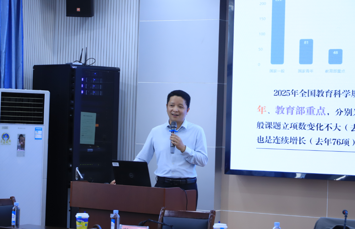 謝凌凌教授結(jié)合自身深厚的課題評審經(jīng)驗,多年學術(shù)研究積淀及最新政策解讀,系統(tǒng)拆解了教育類高水平科研課題申報的核心要點。他明確指出當前廣西課題申報中“國家重點類別缺失”的現(xiàn)狀,為我校教師精準把握申報短板,調(diào)整申報定位提供了關鍵參考。同時,他聚焦黨的二十屆四中全會精神,深入解讀“教育、科技、人才”一體化部署中的細分政策要點,將政策導向與自身研究經(jīng)驗相結(jié)合,強調(diào)選題需緊扣國家戰(zhàn)略需求與學術(shù)研究前沿,為教師搭建起“政策解讀—研究落地”的銜接橋梁。