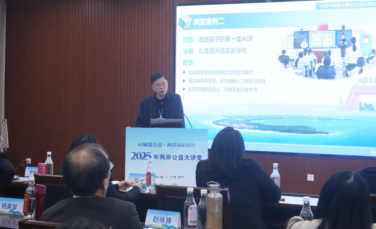 12月9日,以“AI賦能公益,兩岸同心同行”為主題的2025年兩岸公益大講堂在南寧舉行。本次活動由中國宋慶齡基金會與臺灣張老師基金會共同主辦,中國宋慶齡基金會培訓(xùn)交流中心與廣西壯族自治區(qū)人民政府臺灣事務(wù)辦公室聯(lián)合承辦。我校代表在會上向兩岸公益與教育界同仁,系統(tǒng)介紹了利用人工智能技術(shù)助力教育公平的探索與實(shí)踐。