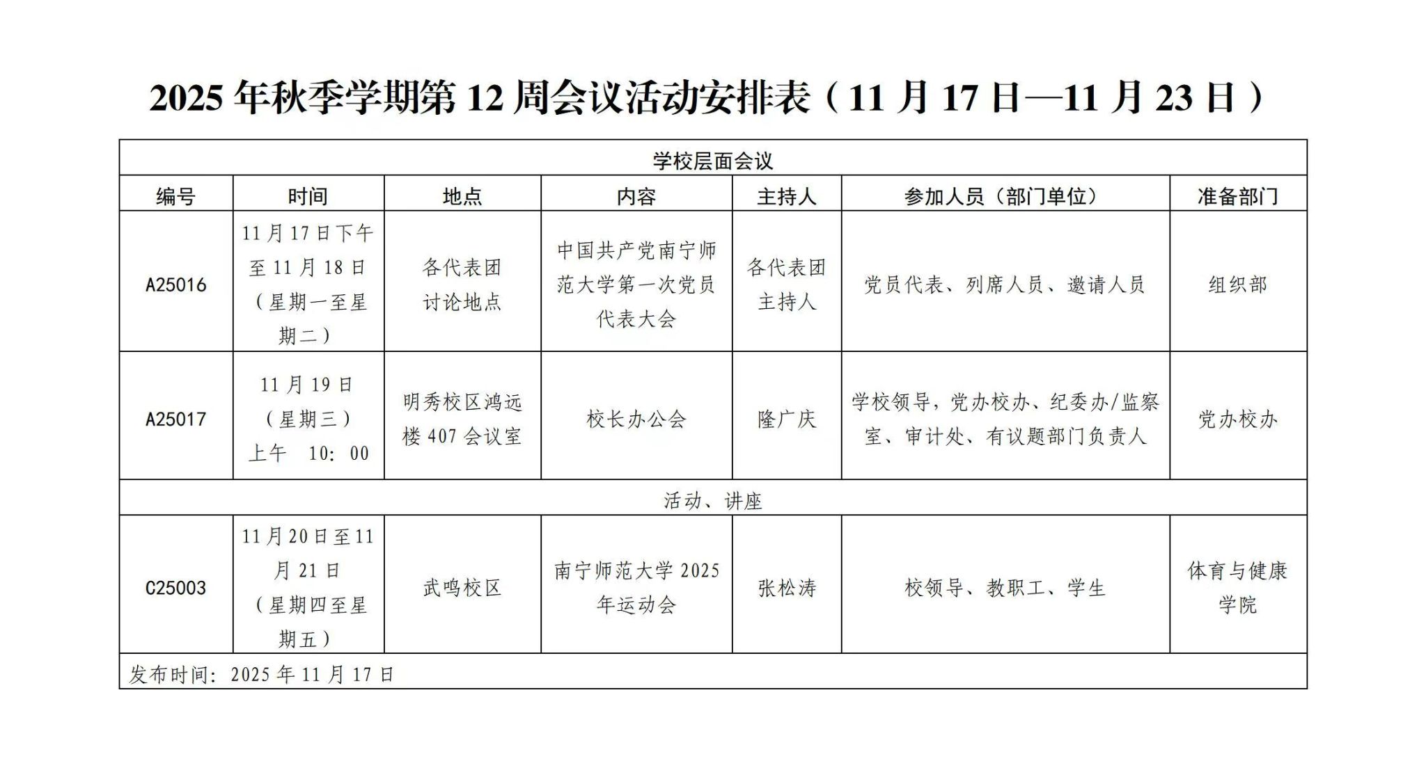 2025年秋季學期第12周會議活動安排表(11月17日—11月23日)